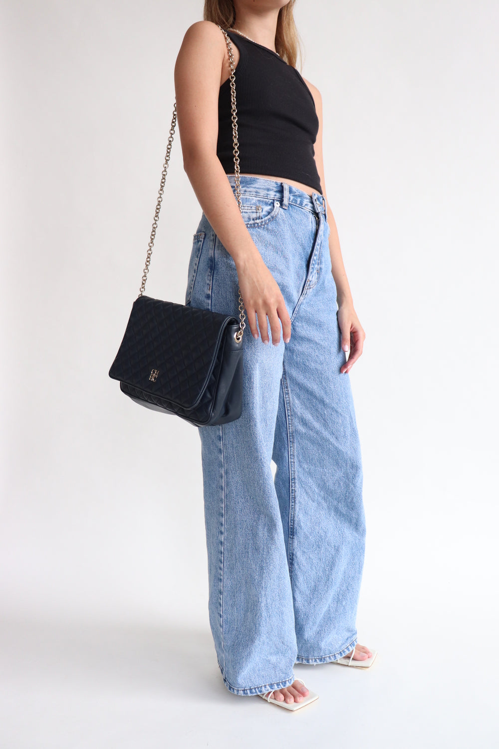 Cartera crossbody con cadena y logo pequeño de metal en frente